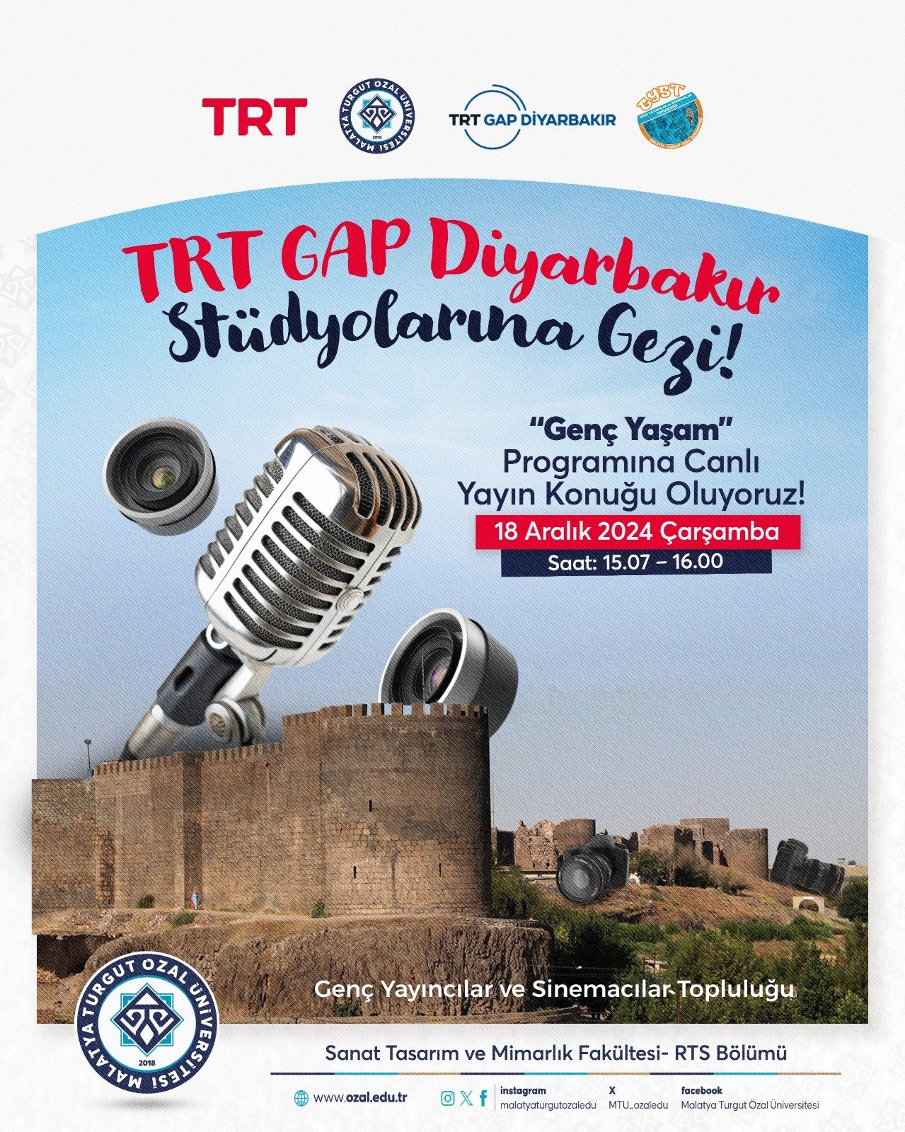 On Wednesday, December 18, 2024, as the Young Broadcasters and Filmmakers Society (GYST) and the Department of Radio, Television and Cinema (RTS), we are organizing an educational and cultural trip to TRT GAP Diyarbakır studios. On the same day, we will be a live guest on TRT GAP Diyarbakır radio in the program “Young Life” (15.07-16.00).