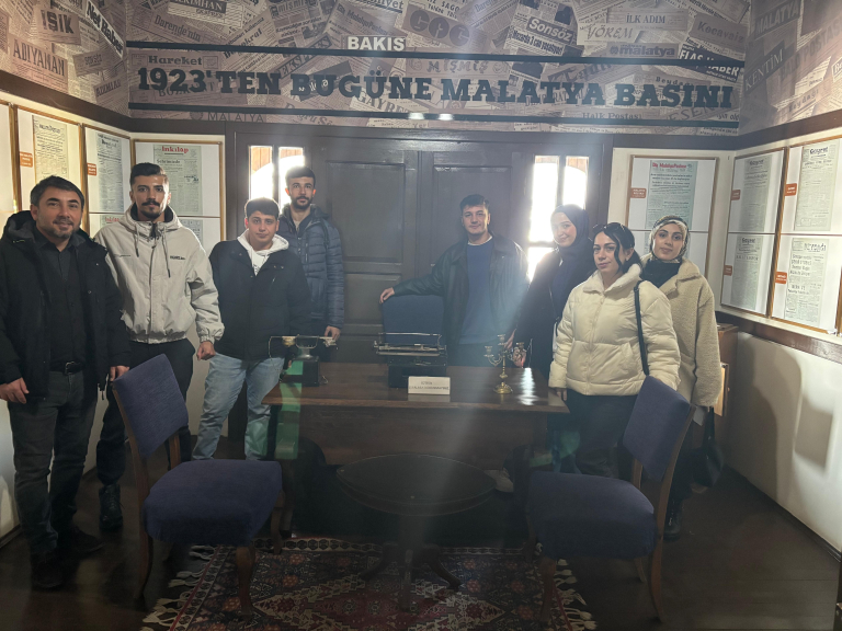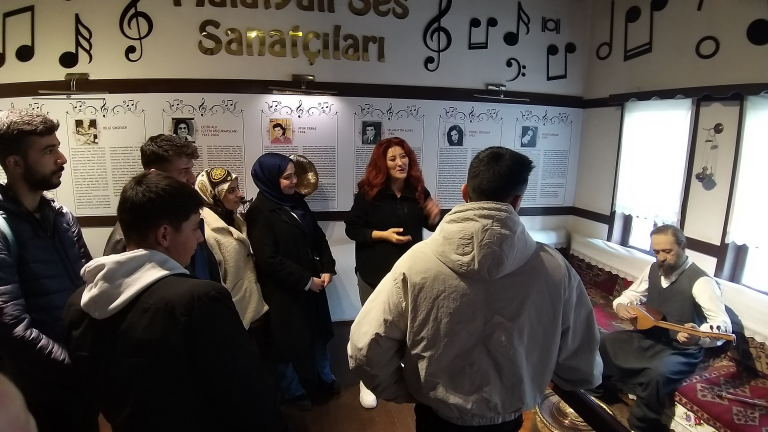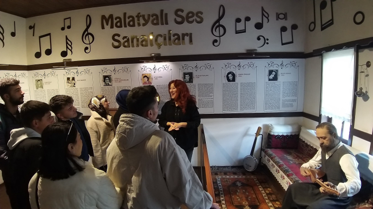 Radyo, Televizyon ve Sinema Bölümü öğretim üyeleri Doç. Dr. Vefalı ENSER ve Doç. Dr. Mevlüde BATUR eşliğinde bir grup öğrenci Sanat Sokağı’nda bulunan Malatya Kültür Evi’ni ziyaret ettiler. Öğrenciler, Malatya yöresel kültürünü yansıtan, yaşam tarzlarını, gelenek ve göreneklerini kendinde birleştiren Malatya Kültür Evi’nde sergilenen çeşitli el işlemeleri, eski yaşama ait kayısı odası gibi yöresel odalarda sergilenen tarihi eşyalarla tanıştılar. Malatyalı sanatçıların bal mumu heykellerinin ve kişisel eşyalarının sergilendiği özel odaları da yakından gören öğrenciler, Malatya’nın yok olmaya yüz tutmuş yöresel kültür ögelerinin yaşatıldığı kültür evi ile ilgili memnuniyetlerini dile getirdiler ve kültür evi çalışanlarına teşekkür ettiler.